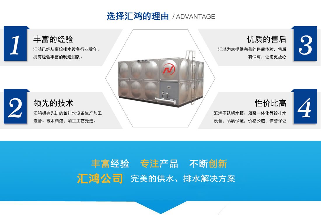 鹽城匯鴻供水設(shè)備有限公司是一家專業(yè)從事供排水設(shè)備系統(tǒng)生產(chǎn)、銷售與工程安裝于一體的專業(yè)企業(yè)。本公司主要生產(chǎn)、銷售、安裝各類不銹鋼水箱、箱泵一體化、不銹鋼保溫水箱、組合式水箱、聚氨酯保溫模塊、圓柱形水箱、消防水箱、玻璃鋼水箱、玻璃鋼化糞池等十多個系列數(shù)百種規(guī)格,產(chǎn)品廣泛應(yīng)用于建筑、環(huán)保、化工、食品、消防等各個領(lǐng)域。具有優(yōu)質(zhì)高效、節(jié)能環(huán)保、安全可靠、實(shí)用方便等優(yōu)點(diǎn),是二十一世紀(jì)商用和家用生活的首選產(chǎn)品。本公司生產(chǎn)設(shè)備先進(jìn),技術(shù)精湛,各種產(chǎn)品的加工工藝,技術(shù)性能和衛(wèi)生指標(biāo)均符合國家標(biāo)準(zhǔn),并可根據(jù)用戶提供的技術(shù)參數(shù)和要求設(shè)計制造現(xiàn)場加工……【更多詳情】 | |